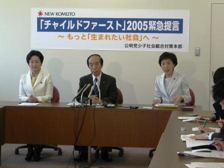 2005年3月31日2005年kanamoto 「チャイルドファースト」2005 緊急提言発表本日「チャイルドファースト」2005緊急提言を発表しました。中央幹事会終了後坂口副代表、浜四津代表代行と私の3人で記者会見を行いました。議員になり記者会見は初めてですが、私が進行役を務めました。 チャイルドファーストとは […]